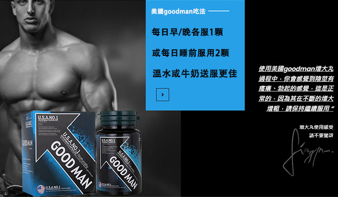 GOODMAN增大丸(好男人膠囊) 是專為男性設計的高效增強產品,幫助增大陰莖,提升性功能。每日服用二顆,連續三罐可見明顯增大效果,三罐以上效果更加顯著。一個療程平均可增長1-2CM,粗度增加25%-30%,並有效改善性功能的穩定性與持久力。美國GOODMAN增大丸適用於18-60歲成年男性,讓您在自信中提升男性魅力。