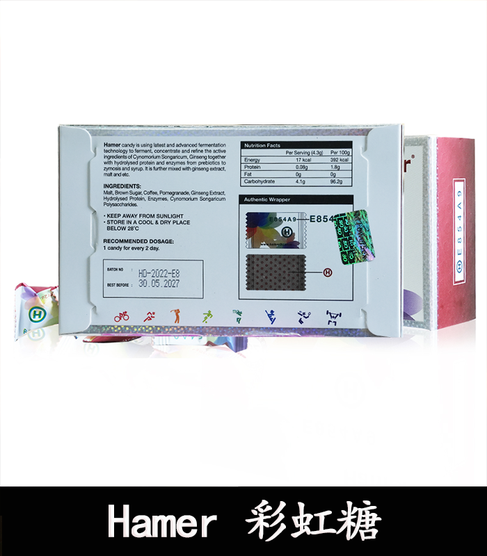 產品簡介: 汗馬糖Hamer二代彩虹糖由馬來西亞原廠出品,結合多種名貴草本植物提取物製成,如鎖陽、人參皂苷、石榴多酚、水果酵素等天然成分,無添加任何刺激性化學物質。該產品經過科研人員長達15年的研究與測試,並且通過了多項實驗,證實無毒無副作用,為一款安全的純天然保健食品。