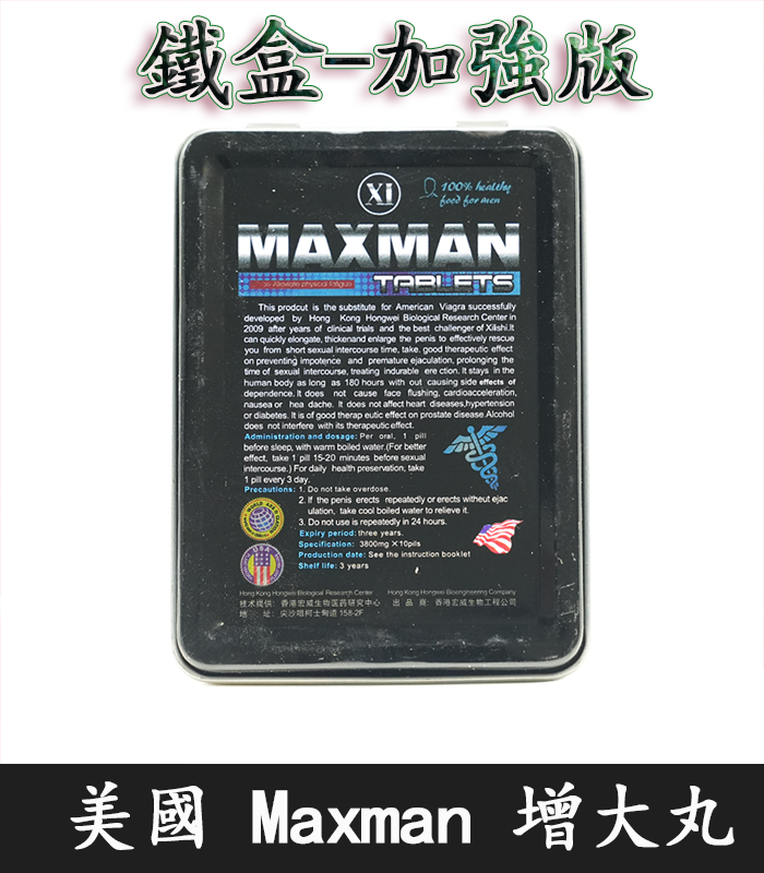 美國【MMC】Maxman加強版鐵盒裝是專為陰莖增大而研製的全新升級版,專門針對亞洲男性體質,配方經過強化,效果更顯著。每盒內含十顆增大藥錠,包裝精美,攜帶方便,是男性增強自信、改善房事質量的理想選擇。