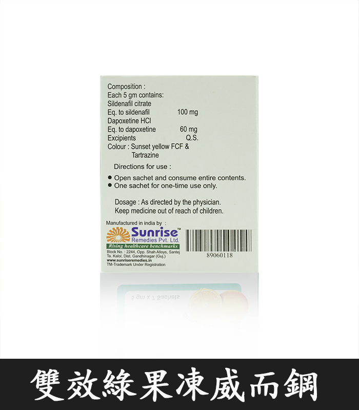 果凍威而鋼Super P-Force Oral Jelly,又稱液體水果威而鋼雙效,印度液體威而鋼雙效是壹種有效治療勃起功能障礙和早洩的藥物。Super P-Force Oral Jelly果凍威而鋼的主要活性成分是西地那非100mg和達泊西丁60mg,能增加陰莖的血液循環,刺激男性的自然性喚起與增長勃起與射精耐久時間,可以幫助使用者獲取長時間的勃起和強大的性高潮。
