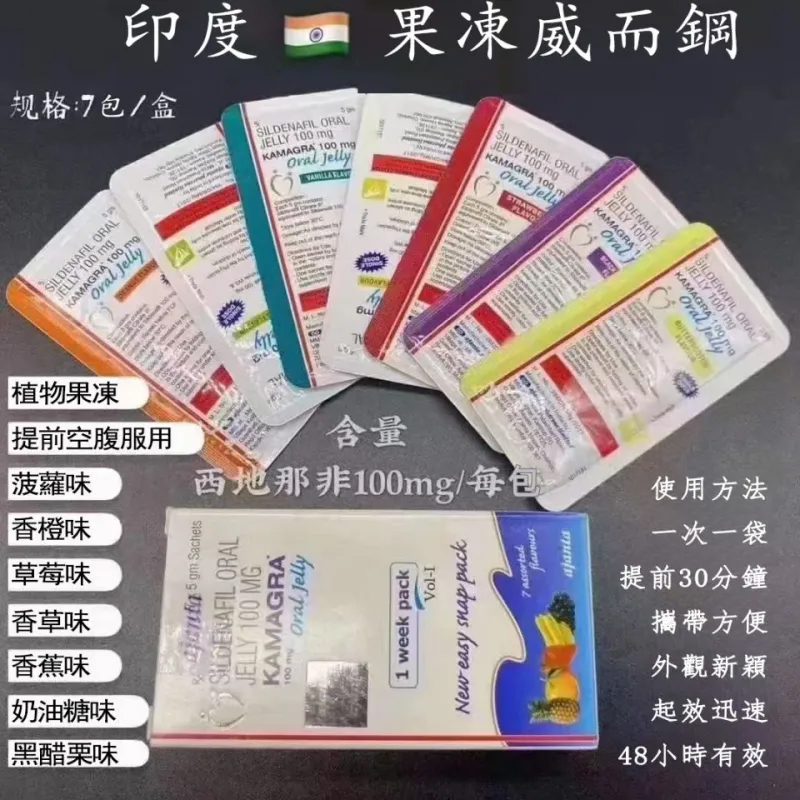 液態果凍威而鋼Kamagra Oral Jelly 100mg 是世界上第一個研究出的液態威而鋼,台灣多數叫它果凍威而鋼,由於有七種水果味,及生效時間比藍色小丸子快速,很多人也叫它為果凍威而鋼,速效威而鋼,水果味威而鋼